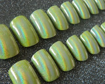 Extra Short Green Holographic Press on Nails.