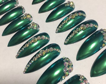 False Nails - Green extra long stiletto press on nails with crystals