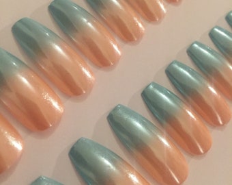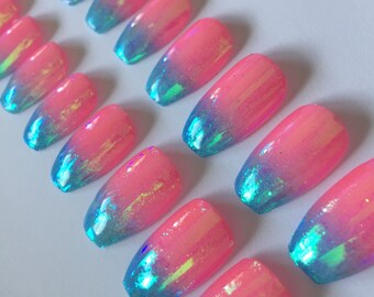 Pink and Blue Ombré Shimmer Extra Long Coffin/Ballerina Shape False Press On Nails