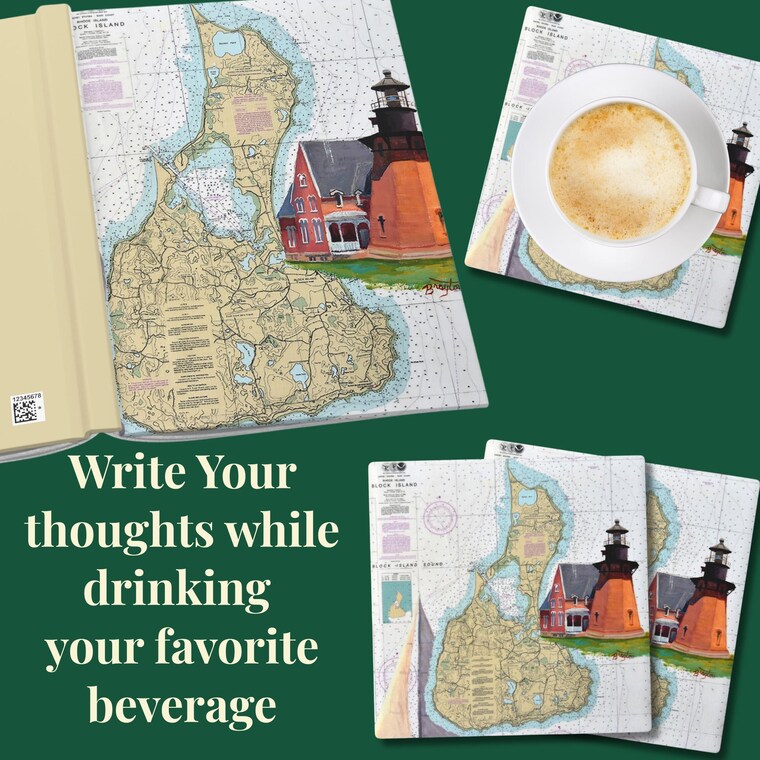 Block Island Rhode Island Chart and South Lighthouse Coaster and Hard Covered Journal. Makes a great gift.