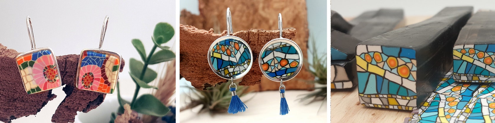 Our jewels are handmade, using mainly polymer clay handled with different techniques such as “Millefiori”, “Mokume gane”, Varnishing and Particle lineup. With these methods, we get different designs that afterwards are mounted in pewter plated bases, always of the highest quality and antiallergenic.