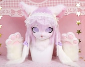 Pastel furry plush animal set in mint, pink and lavender, big sparkly eyes, perfect gift for plushie and fursuit fans -