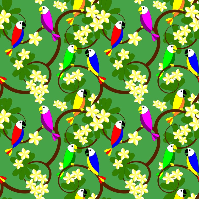 Tropical digital paper with parrots and Plumeria tree.