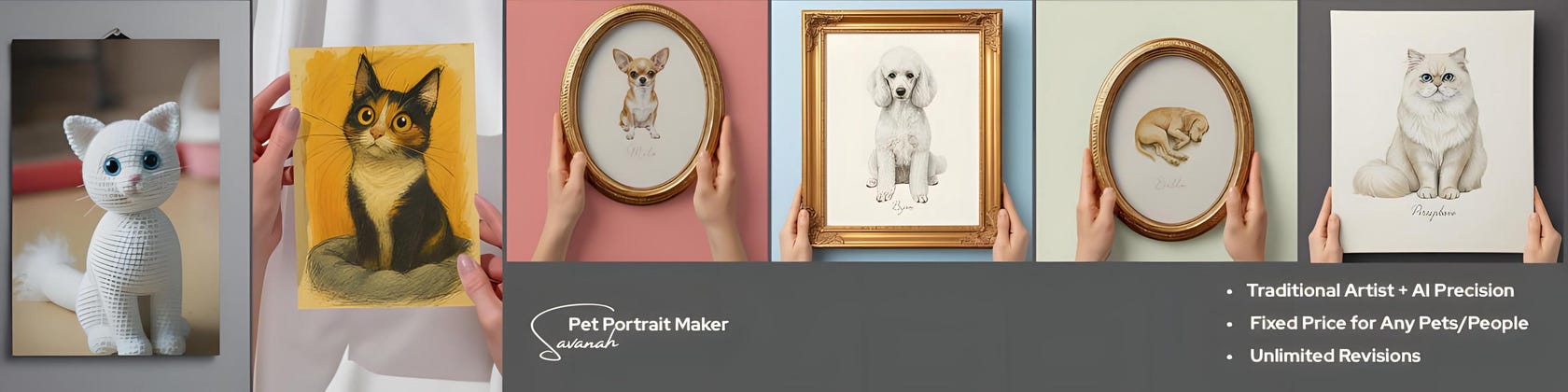 Hi! I’m Savannah Mae, artist behind PetPortraitMaker. I live in Texas with my dogs, Copper and Rosie, who inspire my pet portraits. When I’m not drawing, we’re exploring or chasing sunsets. I pour that same love into every portrait.