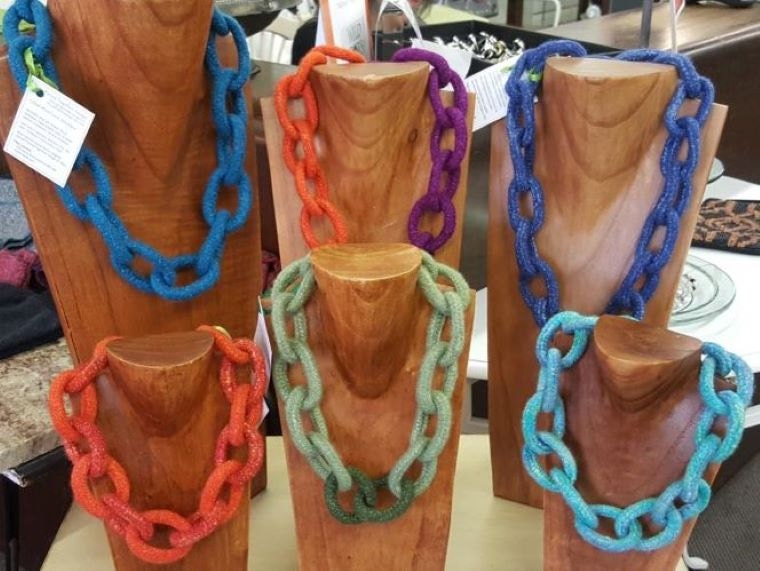 Une grande partie de ce que je fabrique intègre désormais le recyclage et la réutilisation. Les chutes de colliers feutrés deviennent des perles enveloppées de laine, et les morceaux de tissu provenant de ma gamme de sacs de rembourrage d'automobiles vintage et de divers projets de couture et de courtepointe deviennent des collages.