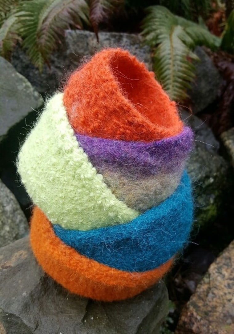A great deal of what I make now incorporates recycling and reuse. The scraps from felted necklaces become wool wrapped beads, and the fabric pieces that come from my line of vintage auto upholstery bags and various sewing and quilting projects become collages.