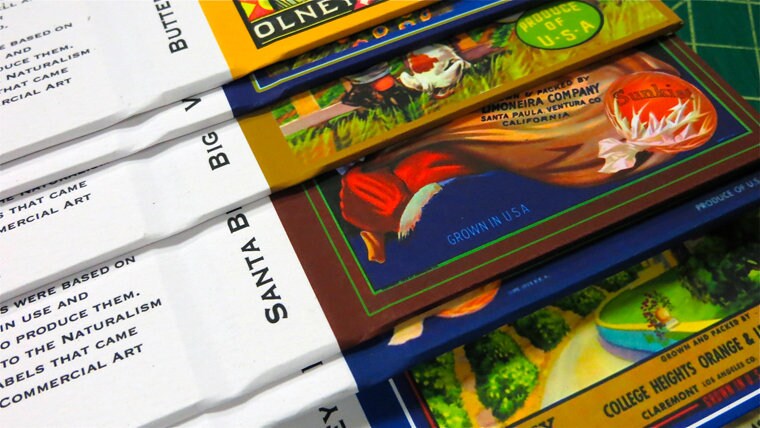 The Petite Journals featured in my Etsy Store have covers based on Vintage Fruit Crate and Seed Packet art. I find labels, recover them using Photoshop and resize them to use as the cover art for this unique journal series.