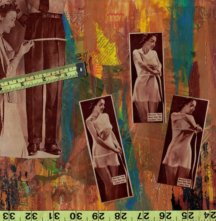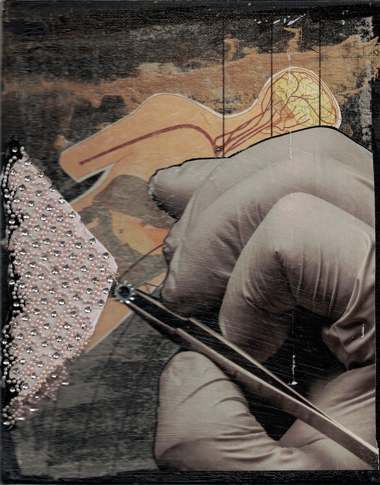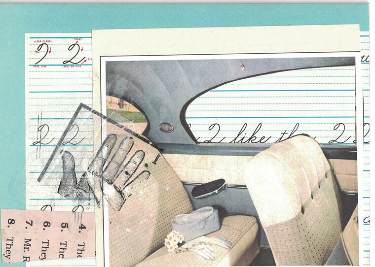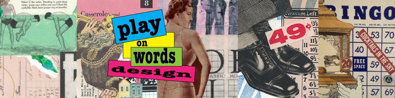 Quirky collage, vintage materials, one-of-a-kind mixed media.
