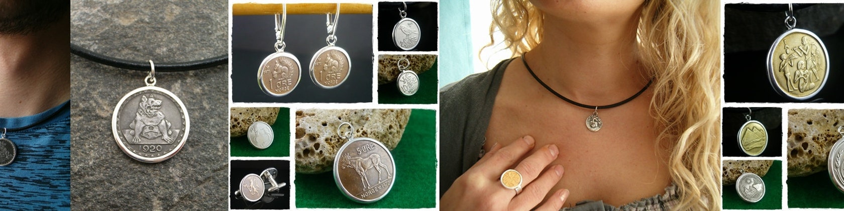 I make jewelery from minerals, precious stones, coins from all over the world, ceramics all in hand-bound in sterling silver 925 polished to a super-gloss or raw, matted and oxidized.