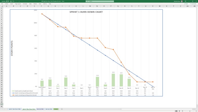 An example of an editable MS Excel Agile Burn Down Chart template. The template includes an example of a Burn Up Chart. -