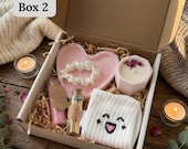 5 out of 5 starsThis beautifully decorated gift box with a charming assortment of items is an absolute delight! Love it! Beautifully crafted rose-shaped candles, some presented in a heart-shaped dish inscribed with Love, cute accessories with a pair of adorable bunny socks, some extras like pink salt and small bottle of matches are arranged aesthetically in a simple box with crinkle paper. Loving theme makes this a perfect gift for a special someone. Highly recommended for a thoughtful gesture!