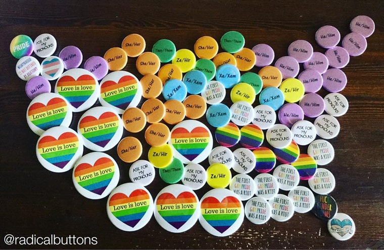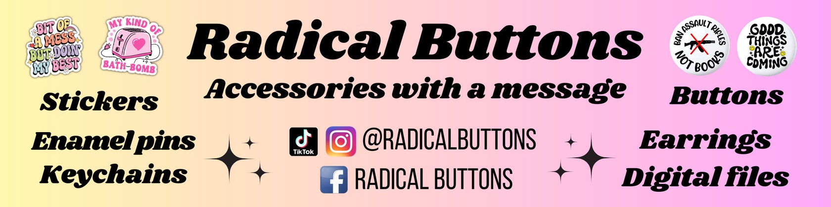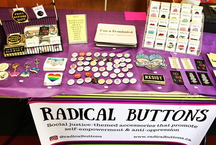 Feminist and social justice-themed buttons and accessories that promote self-empowerment and anti-oppression.