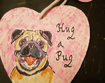 Original artwork wooden plaque Pug portrait 'Hug a Pug'