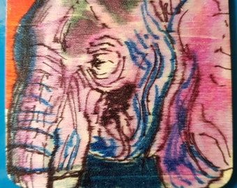 Original artwork small wooden coaster animal portrait elephant face expressionist