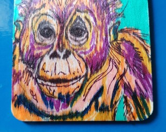 Original artwork small wooden coaster Orangutan portrait