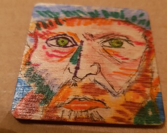 Original artwork small wooden coaster male portrait expressionist