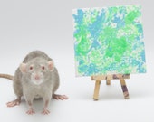 5 out of 5 starsI'm really touched by this painting: I was able to choose my own two colors. Despite the crazy and frantic nature of rats, my painting only had those two colors. With so many color options, I assume my painting was created after I ordered it. I love the the picture of Donut holding the painting. Also including a quick bio and putting it all in a professional looking plastic bag was a nice touch. The package arrived more than 5 days earlier than the earliest expected arrival day. We watch your Youtube videos and are fans. Our fandom is what led me to discovering and buying your rat art. I would have paid more than the price you offered ($5-10 more). Finally, this painting was bought in memory of a loving rat who recently passed, Doughnut. To have the artwork feature a rat of the same name was doubly special. Thank You!