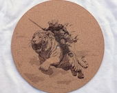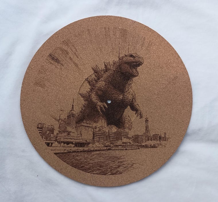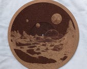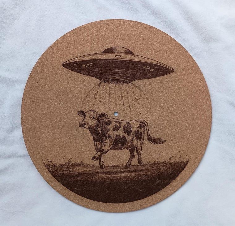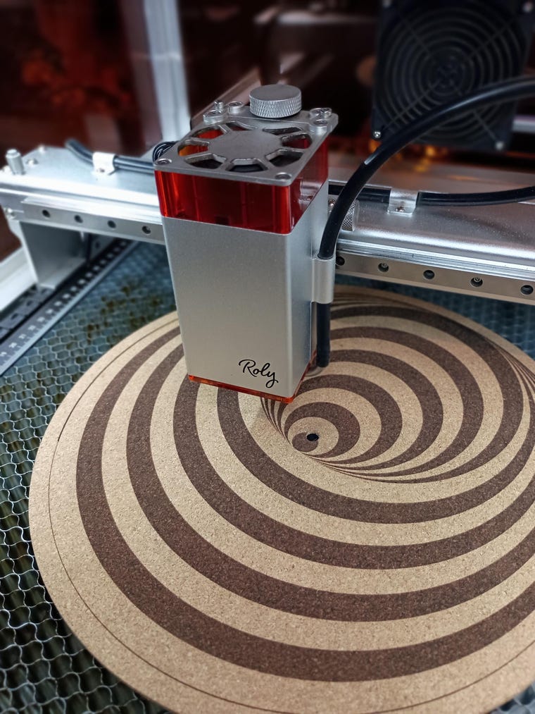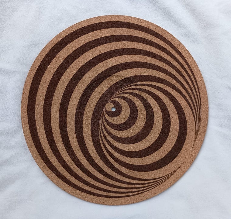 Hand lasercrafted cork platter mats for turntables and record players.