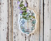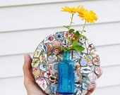 After that project, everything I saw seemed to have the potential to become a mosaic. It took several years for my mosaics to evolve, with trial and error. The day that I found a box of assorted vintage pharmacy bottles at a yard sale, gave me the idea to create mosaic bud vases.