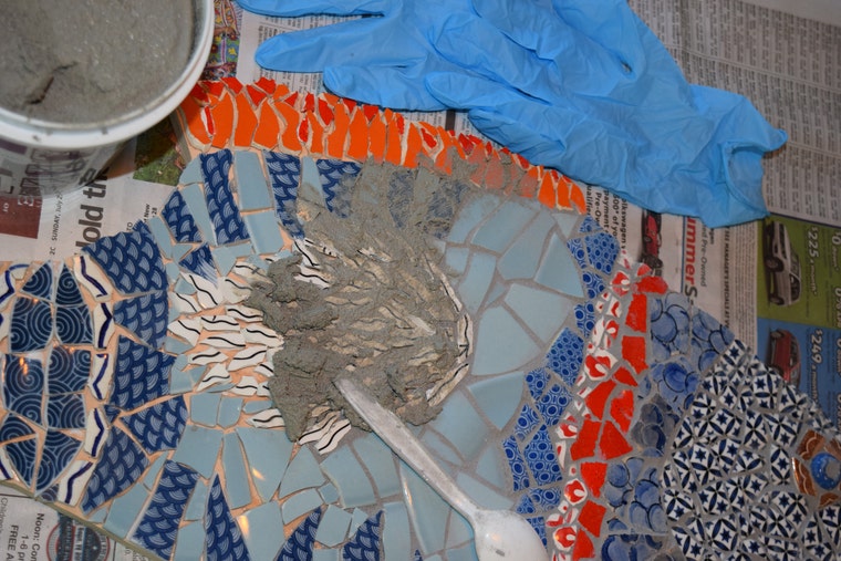 Creating mosaics began for me years ago, after I picked up a craft book about making "crazy mosaics". One evening years ago, I was walking my dog, when I spotted a wooden framed mirror which a neighbor had put out on a curb next to trash cans. That mirror became my first mosaic project, by adding a mosaic design of broken china on the frame that surrounded the mirror.