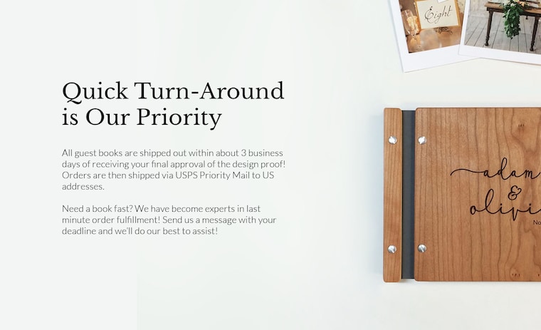5 out of 5 starsThis is the third time I have ordered a guestbook from this seller. Each time the book arrives on time. The books are beautiful and so personal. You won’t be disappointed.