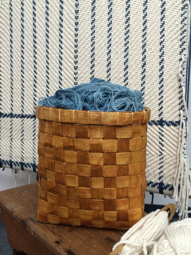 Cedar Bark Gathering Basket & Coast Salish Shawl in progress on a traditional Salish floor loom. -