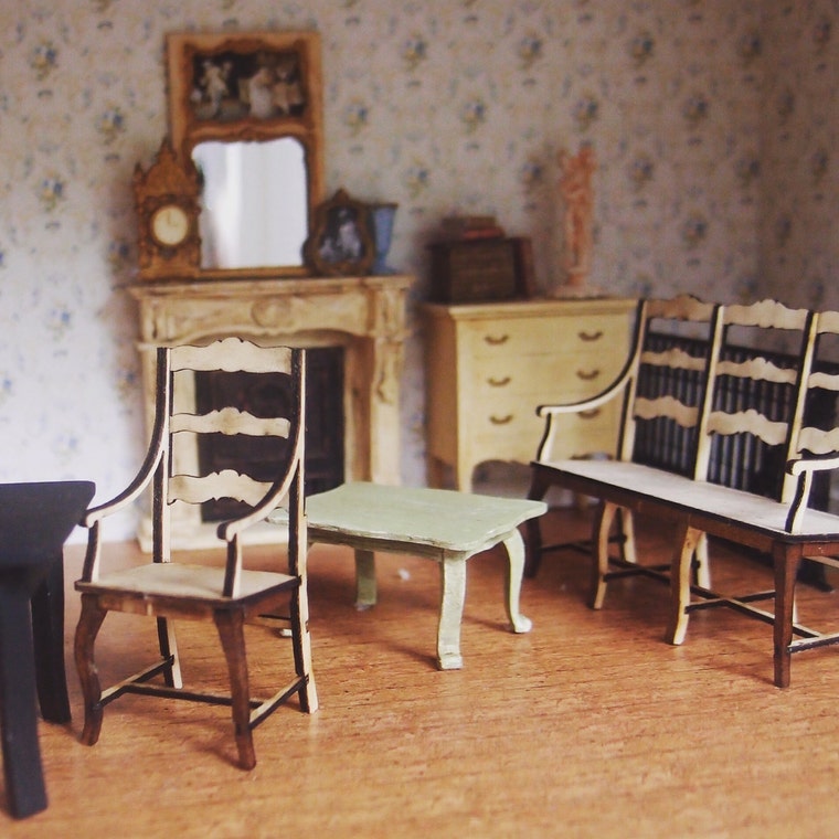 My little French shop, the Chantilly, with some of my prototypes. Here, a chair and settee, just finished. -