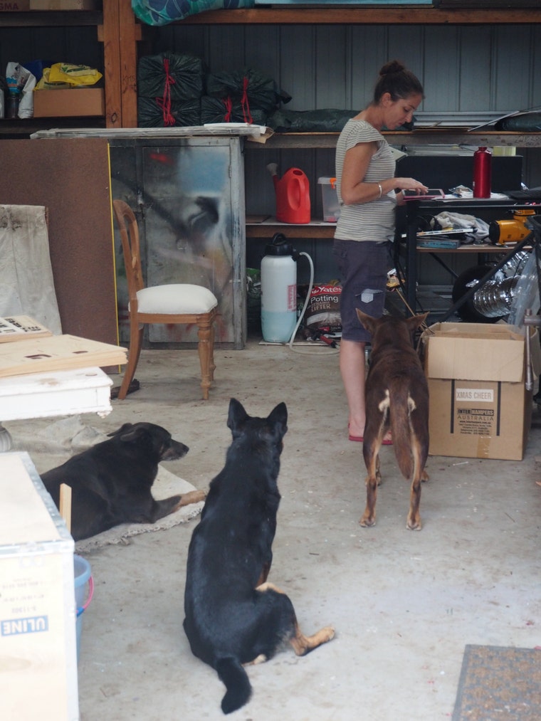 In the workshop. My mum's dogs wait patiently for me to kick the ball. Sometimes they wait a long time!