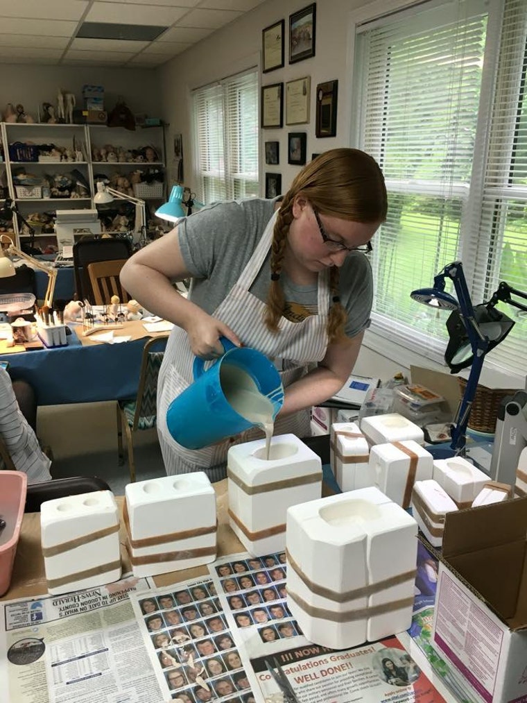 Pouring the doll parts with porcelain slip and plaster doll molds.