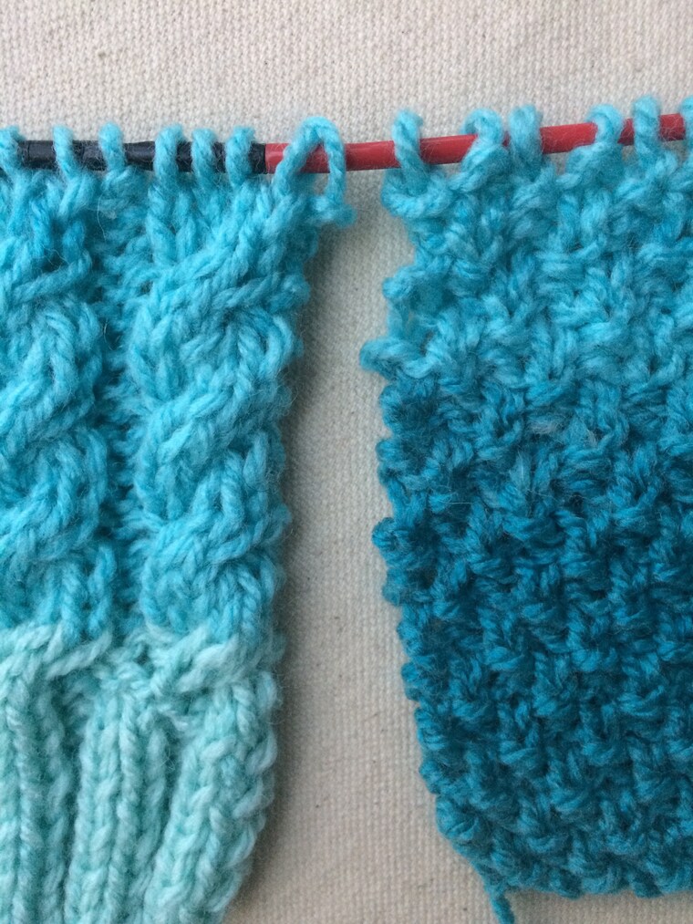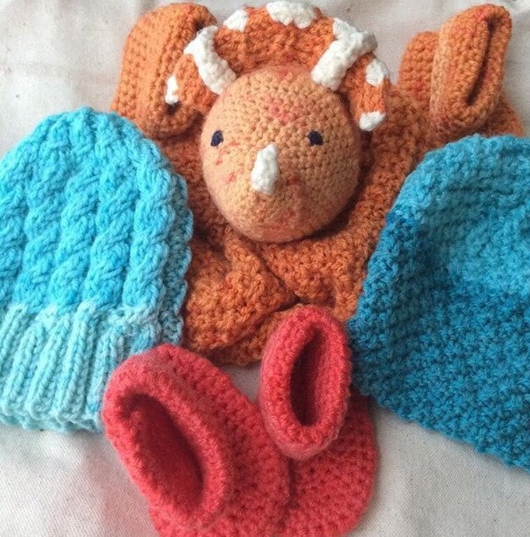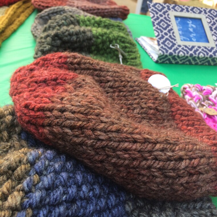 Set up for a pop up market. Pictured above are beanies made with self-striping yarn.
