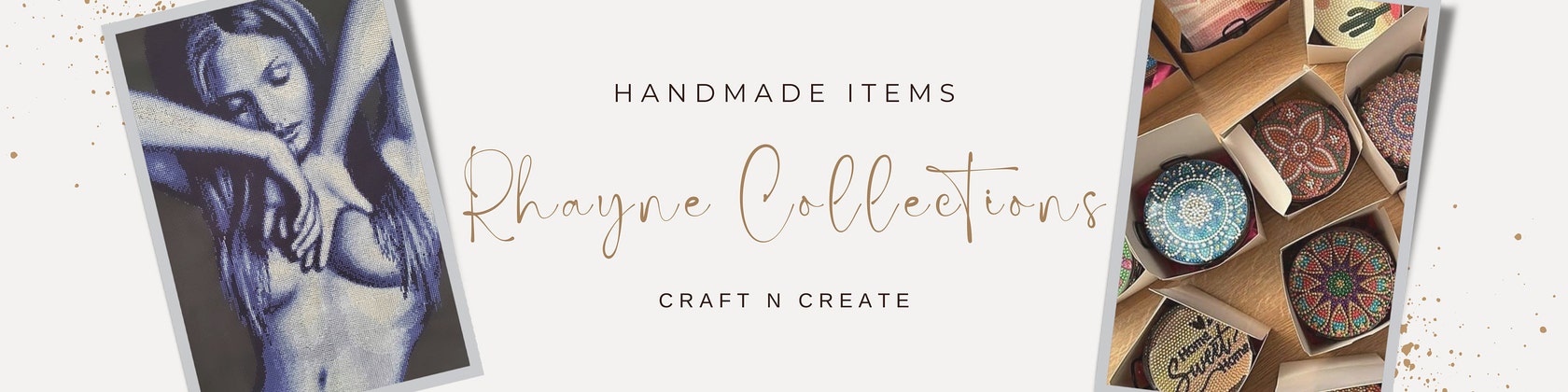 En RhayneCollections / Create N Craft, encontrará una selección de artículos hechos a mano. Desde llaveros, posavasos, tarjetas y pegatinas hasta exhibiciones de arte hechas con cuentas de diamantes.