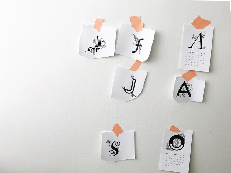 Hand drawing botanicals on top of the modern alphabet calendar.