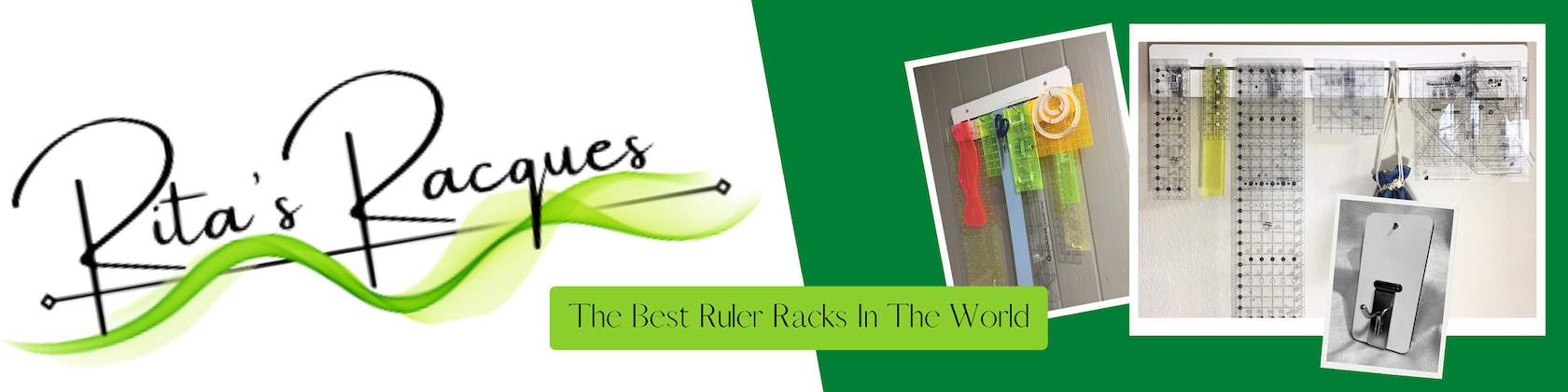 Rita's Racques came about because I had rulers everywhere in my sewing room. My husband, Dennis, and I worked on a solution that would hold more than the 10 or so rulers that can be held on a table rack. We went through many designs until we came up with the perfect solution. Our racks are amazing not only because thay hold so many rulers in such a small space but no special tools are needed to hang the racks. The rack is based on physics and because it is all that is needed is to tap two nails in drywall and hang the rack like a picture. That's it! It takes less than five minutes to assemble and hang the rack on the wall.