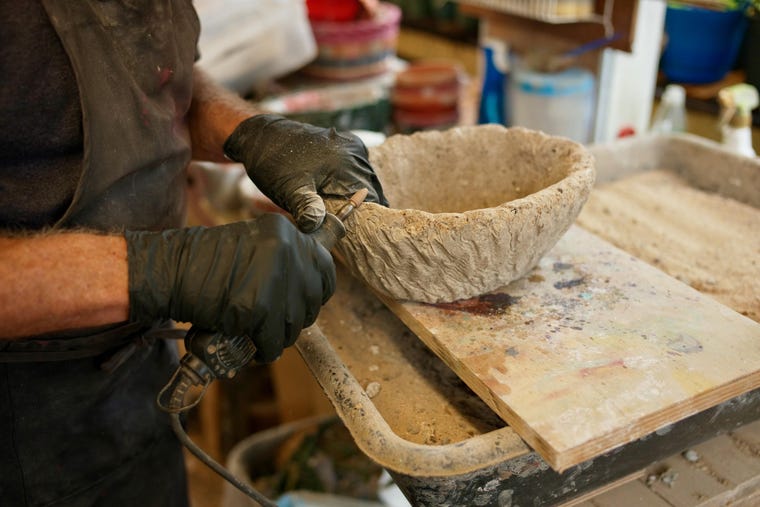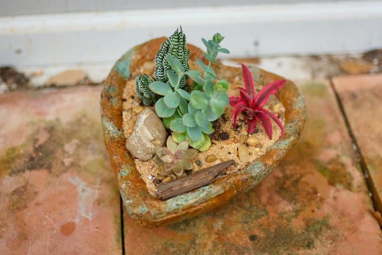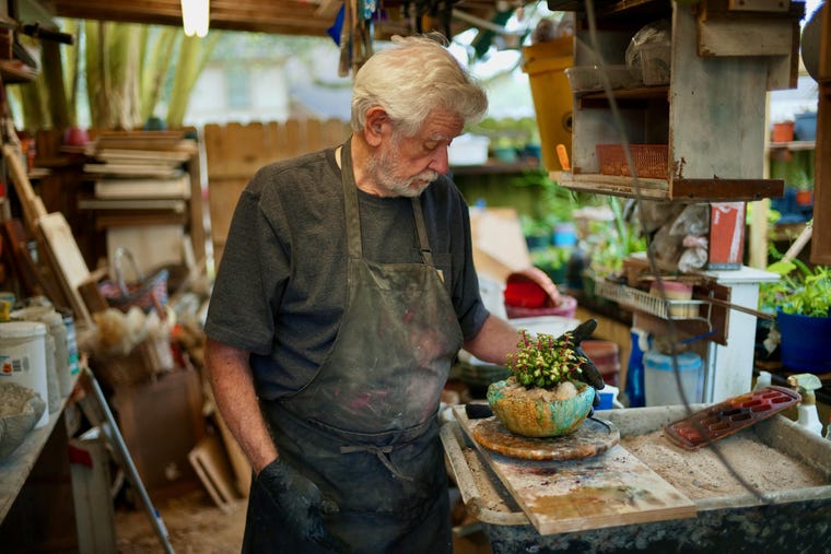 Rustic Pots wurde über 20 Jahre hinweg perfektioniert, und ich habe bereits Hunderte von Menschen mit meinen kunstvoll gestalteten und handgefertigten Sukkulententöpfen versorgt. Jeder Topf ist ein Unikat mit einzigartigem Design und Charakter, der durch Form, Textur, Farbe und die verwendeten Materialien geprägt ist. Ich mische jede Materialcharge von Hand, presse sie in eine Form, forme den oberen Rand des ausgehärteten Topfes mit einem Dremel-Werkzeug, trage die Beize auf und verblende sie, und versiegele jeden Topf einzeln. Zu meinen Werkzeugen gehören ein Mischbehälter, Spachtel, Feilen, meine Bohrmaschine und mein Dremel-Werkzeug sowie verschiedene Pinsel für Detailarbeiten und zum Versiegeln.