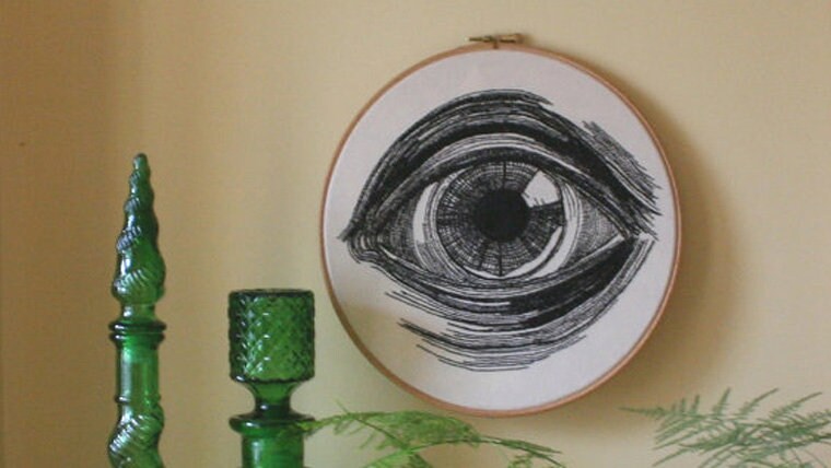 Hand stitched embroidered eye, This currently hangs in an opticians office in the US. -