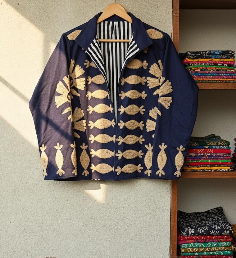 Hand block printed Sujani cotton jacket, handcrafted for everyday comfort.