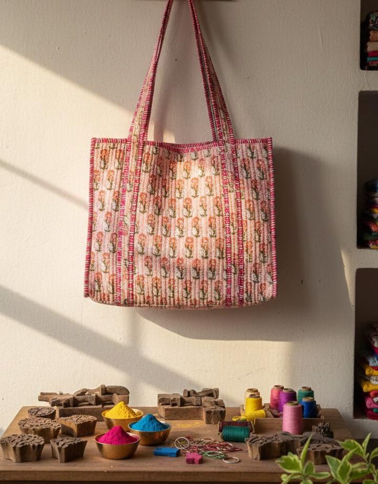 Hand block printed quilted cotton tote bag, handcrafted for everyday use. -