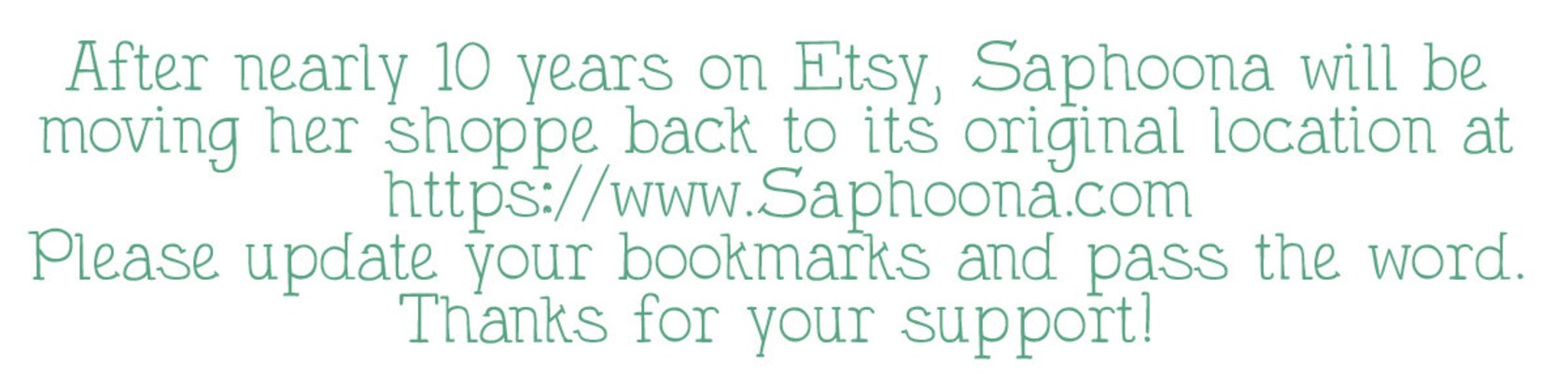 * * * * PLEASE NOTE: Etsy has decided to "simplify" a seller's policies, but they've made them so simple that they neglected to give sellers and say into making textual additions. Nor have they provided a way for sellers to switch back to our original policies, even though they assure us there is a way to do this. Accordingly, please read the ACTUAL policies for Saphoona's shoppe[before making a purchase] at the following URL