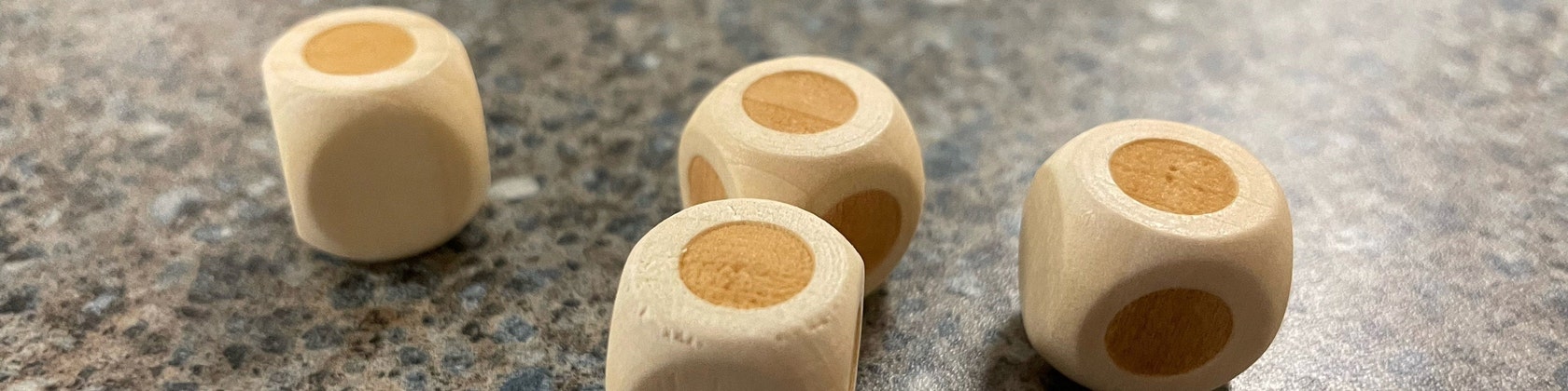 Scrap Dice is a pocket-sized dice game that can be played with two or more players just about anywhere. Playing time typically lasts 15-20 minutes depending on the number of players. It consists of four d6 dice that have three etched sides and three blank sides.