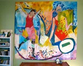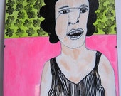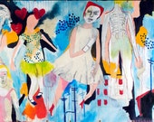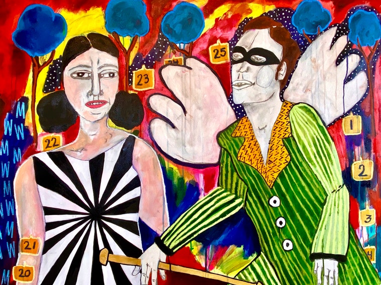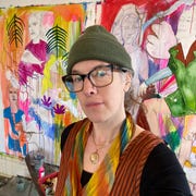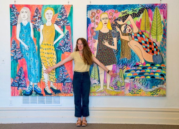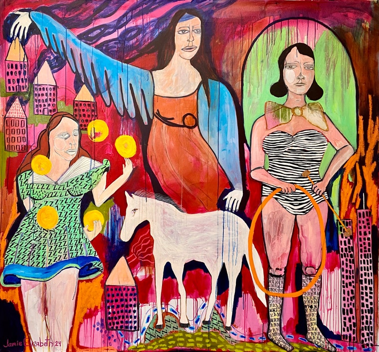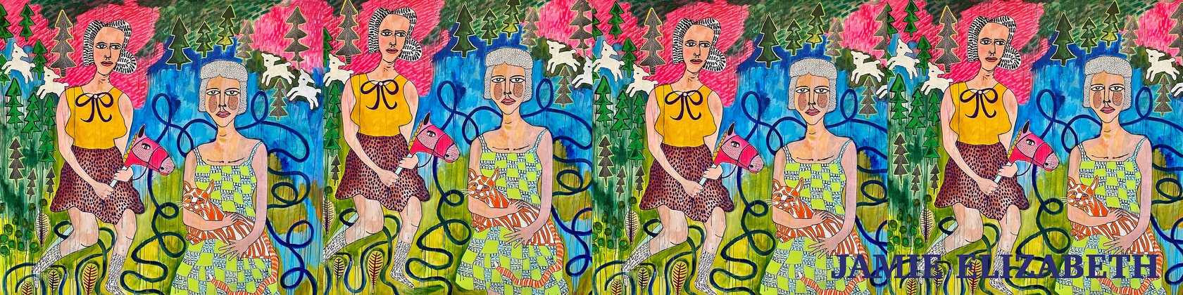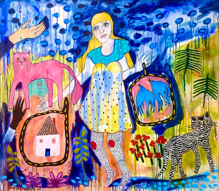 My large scale paintings are on unstretched canvas and always combine female figures, botanical elements and symbolic animals to create surreal and fantastical worlds. Personal and poetic explorations about growing up in the Midwest and my brilliantly vivid wild flower garden are significant sources of inspiration. My paintings evoke memories, imagination, play and dreamscapes. Experimenting with various media such as acrylic paint, pencil, marker, oil crayon, stamps and stencils help enhance my fantastical landscapes in each painting. I love building layers of color, paint drips and texture. Currently, I'm working on a new series of paintings called: Double Bloom.