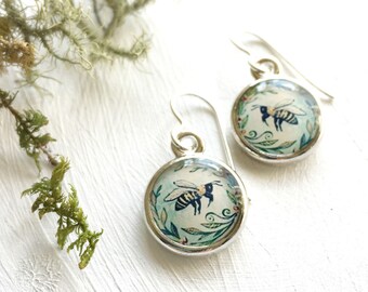 Bee Earrings, Illustrated Honey Bee Earrings, Painted Bee Jewelry, Silver Earrings, Flower Garden Earrings, Green Earrings, Unique Bee Gift