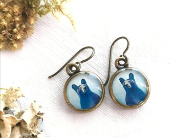 Bear Earrings, Black Bear Earrings, Bear Painting, Blue Earrings, Animal Earrings, Black, Bear, Bronze Earrings