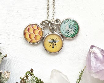 Three Bee Charm Necklace, Queen Bee Necklace, Bee Jewelry, Gift for Bee Keeper, Worker Bee, Honey Bee charms, Silver Nee Necklace