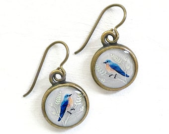 Handmade Painted Bluebird Earrings, Bird Watcher Gift, Birder, Bluebird of Happiness, Art Jewelry, Bronze Bird Earrings