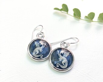 Dragon Earrings, made from an original dragon painting, Navy Blue and white mythical jewelry