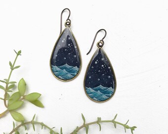Big Starry Ocean Teardrop Earrings, Night Sea, Celestial Waters, Ocean Jewelry