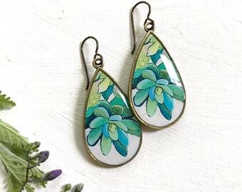 Green Succulent Earrings, Teardrop shape plant jewelry, Unique Succulent Gift