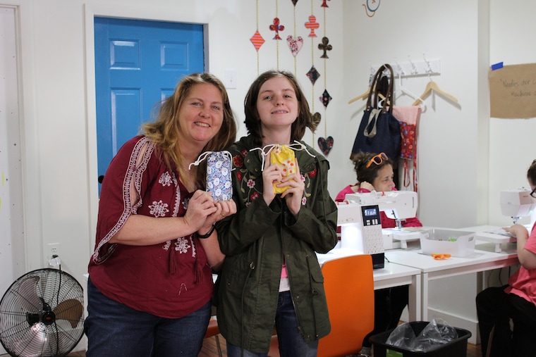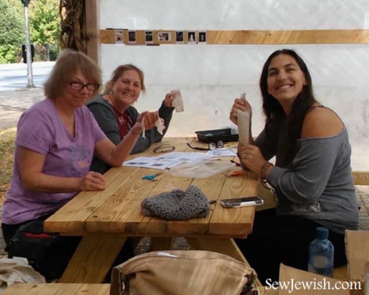 Sewing in the sukkah - Students from my drawn thread embroidery workshop show off their work. -