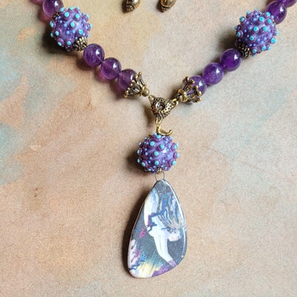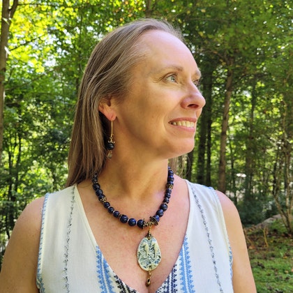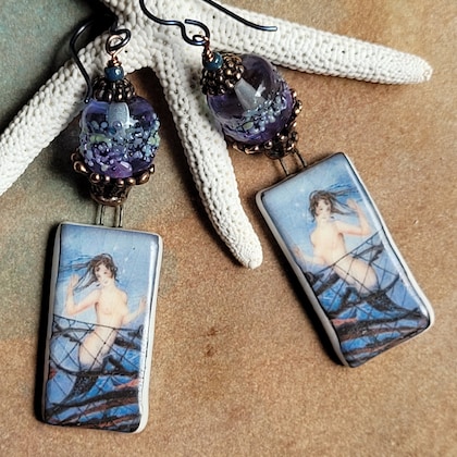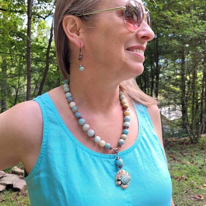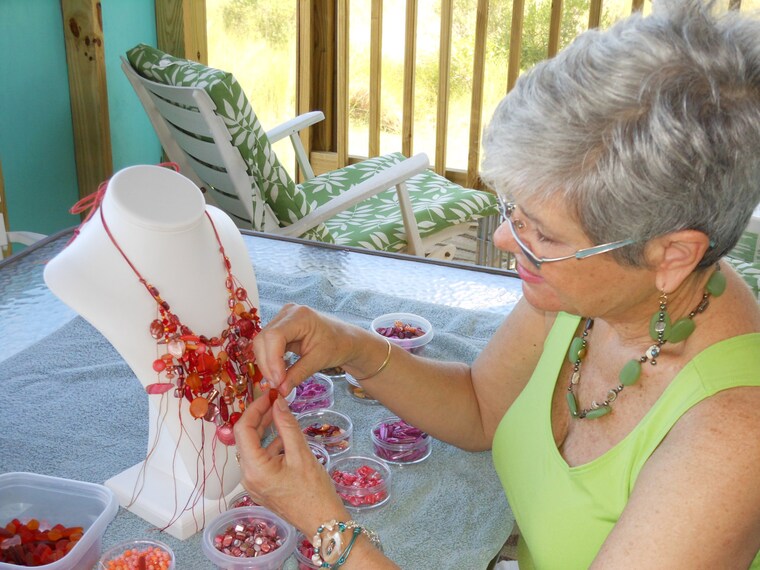 Like I said Santa brought me a bead loom. My husband and I bought a small place at the beach with no studio for large oil paintings, and She Shellz was born! I use materials sourced from Earth and Water--shell products, freshwater pearls, pure metals like copper and silver (and their alloys of brass and bronze,) and linen (from the flax plant, natures strongest fiber.) Artisan glass starts off as sand, basically a natural material. Although I'm a committed vegan, I do use leather and occasionally bone beads. I try to use coral that has not been harvested live. The commercial shells I use are from the Phillipines, where shell farming is a sustainable industry. Of course my very favorite element to use is a shell picked up off the beach!!