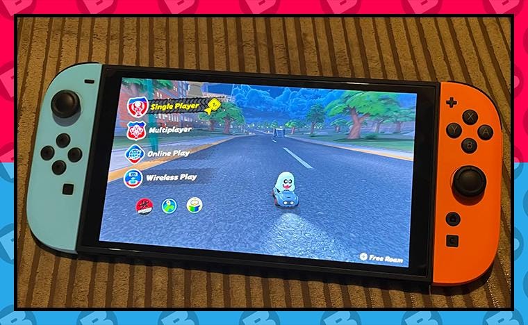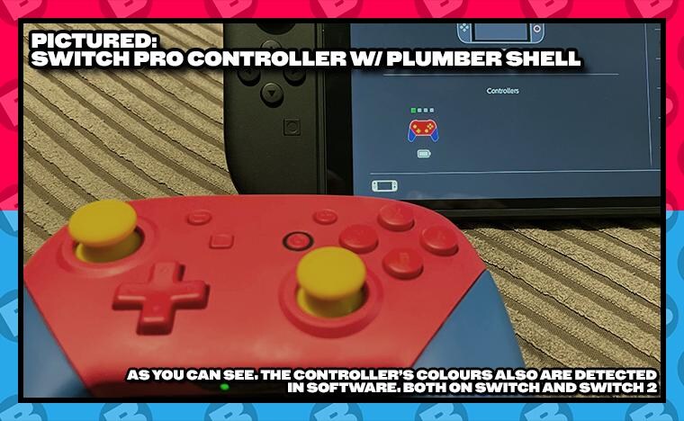 This shows a Pro Controller in our "Plumber" shell alongside the Switch 2, showing the shell in the controller menu. -